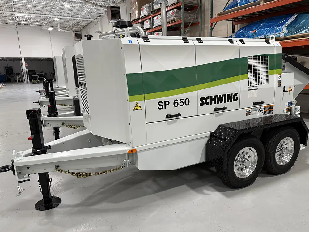 The Schwing SP 750‑15 is a compact yet powerful all‑hydraulic trailer concrete pump offering up to 50 cu yd/hr output and 1,100 psi pressure. It features a Tier 4 CAT® diesel engine (~100 hp), Long Rock™ valve, dual‑cylinder hydraulics, and a hopper agitator—designed for dependable performance and low operating costs.
